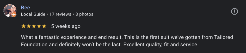 Investing in your first bespoke suit is a milestone. It’s not just a garment it’s confidence, craftsmanship, and a reflection of your personal style. Recent client Bee captured exactly what makes The Tailored Foundation experience stand out, sharing a review that reflects why so many first-time clients return again and again.